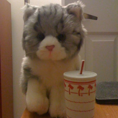 Kitten Buddy takes a drink from the best milk shake in the world.