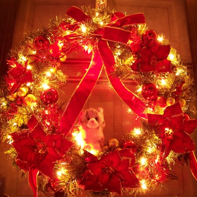 Kitten Buddy puts up the Christmas Wreath.