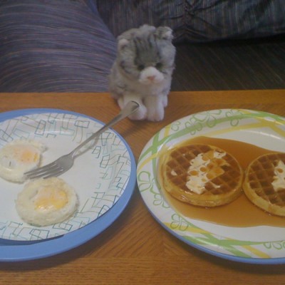 Kitten Buddy enjoys having a big breakfast each morning.