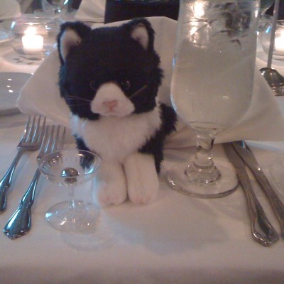Tuxedo Buddy enjoys a glass of water before the events begin.